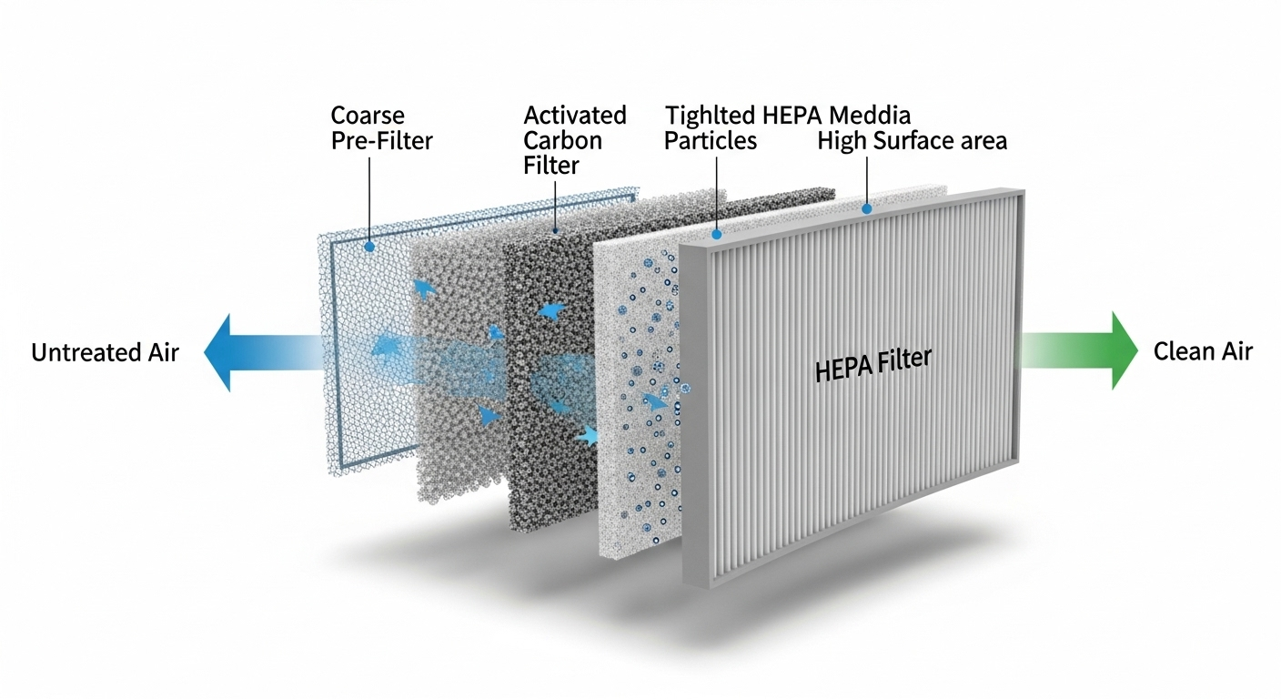 Một hệ thống lọc không khí sử dụng bộ lọc HEPA thường bao gồm nhiều lớp lọc để tối ưu hóa hiệu quả: